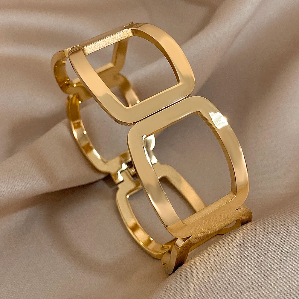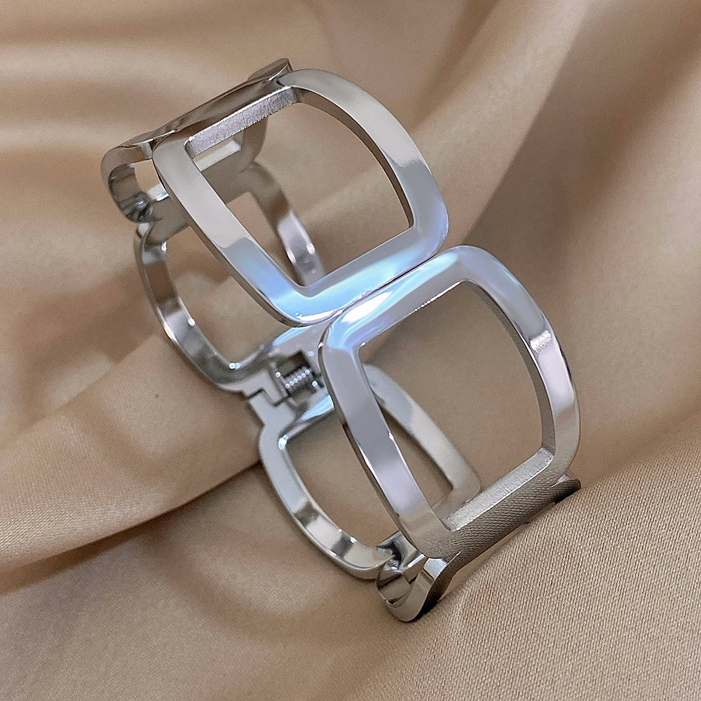 Fashion Simple Hollow Square Circle Geometric Bracelet Chunky Stainless Steel Gold Silver Color Cuff Bangle Jewelry Gifts
